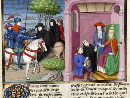 Decima giornata, seconda novella: "Ghino di Tacco cattura e cura l'abate di Cluny. Con la sua intercessione guadagna la grazia del Papa e il titolo di cavaliere". Miniatura tratta dal ‘Decameron’ (codice del XV secolo), Bibliothèque…