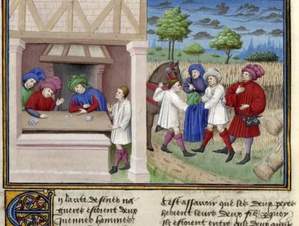 Nona giornata, quarta novella: "Fortarrigo perde al gioco i soldi suoi e di Cecco Angiolieri. Dopo averlo accusato di furto, lo lascia in camicia e per la via". Miniatura tratta dal ‘Decameron’ (codice del XV secolo),…