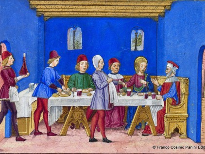 Un sabato, giorno di riposo, a pranzo da un fariseo Cristo guarisce un malato di idropisia, riconoscibile dal ventre gonfio per l’accumulazione di liquidi. Miniatura tratta dal 'Leggendario Sforza-Savoia' (Milano, 1476), Biblioteca Reale, Torino. Tutte…