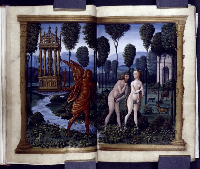 Double miniature: the angel expelling Adam and Eve from Paradise, 1500, New York Public Library, collections.