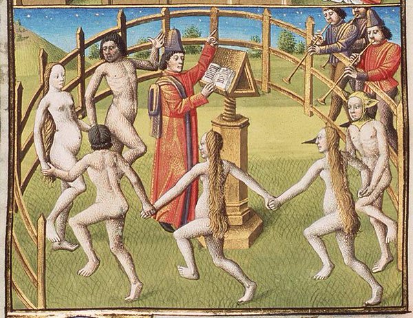 A group of naked men and women dancing around a conductor; three musicians (2nd of 2). The Hague, MMW, 10 A 11 fol. 35v