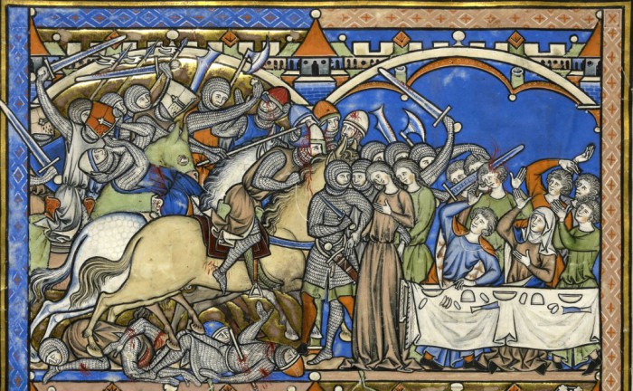“Davide assalta gli Amaleciti durante un banchetto”, miniatura tratta dalla ‘Bibbia Morgan’ (1240 circa), The Morgan Library & Museum, New York.