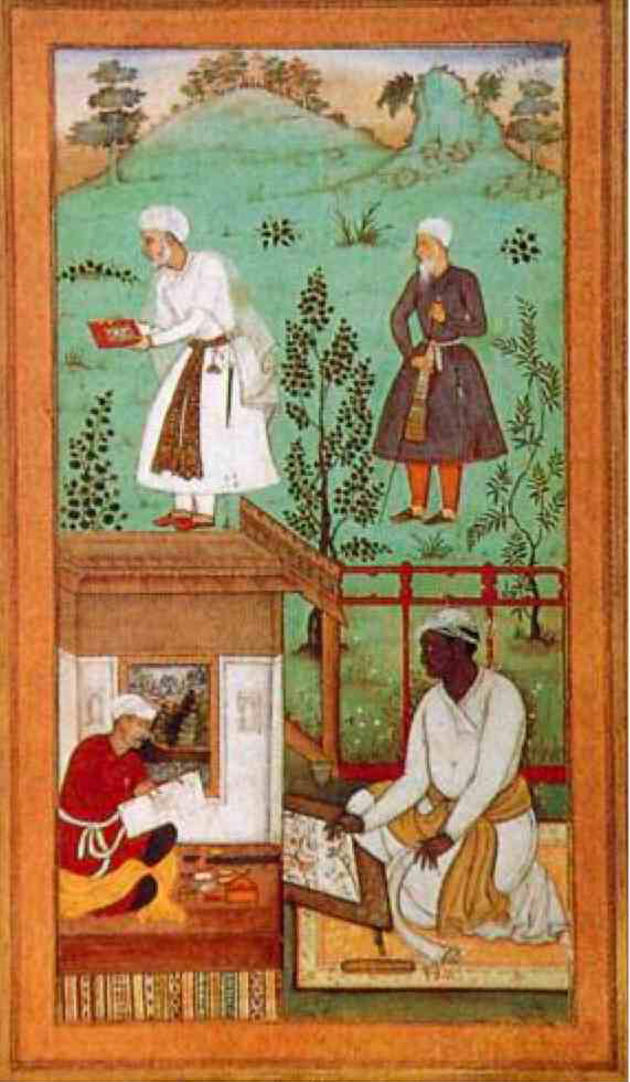 Artisti al lavoro, miniatura moghul dell’epoca di Akbar.