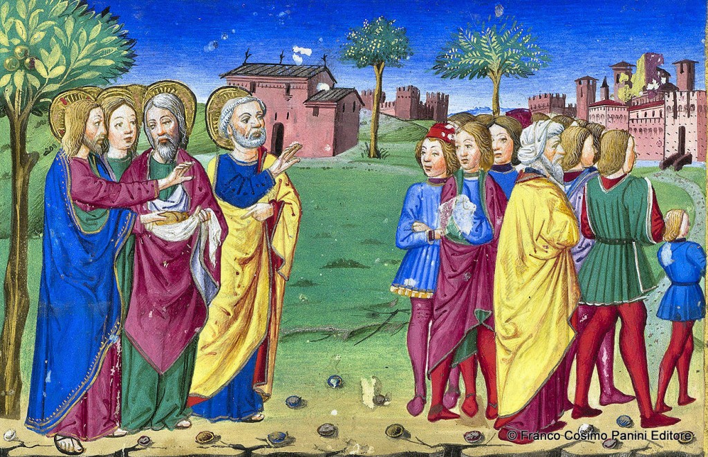 ... ma il Signore fa sedere tutti e distribuisce i cinque pani e i due pesci a disposizione. E mangiono tuti quanti fineche illi sono saciati”.