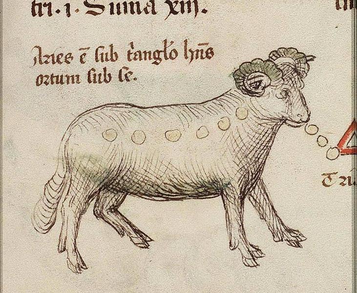 Le rappresentazioni medievali del segno dell'Ariete rivelano un'inaspettata varietà psicologica dell'ovino, che si mostra imbronciato, languido o agguerrito a seconda del codice miniato. Nella maggior parte dei casi si staglia su un prato verde in posa scattante con una zampa leziosamente ripiegata, oppure svetta nel blu del cielo stellato.
