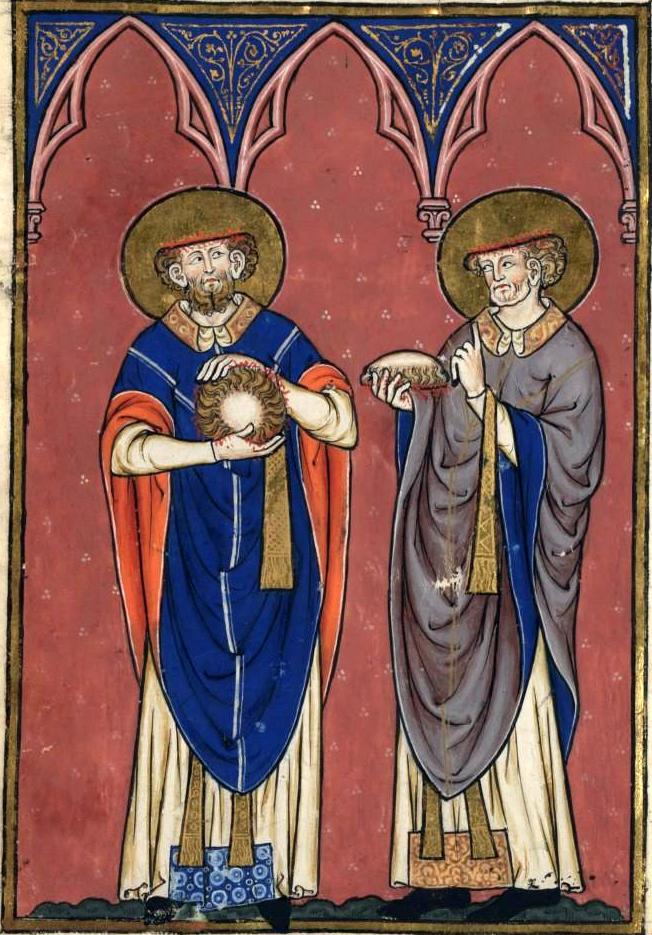 "I santi Dionigi e Piatone", miniatura tratta da 'Images de la vie du Christ et des saints' (Francia, XIII secolo), Bibliothèque nationale de France, Parigi.