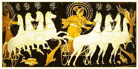 In un’altra immagine, Elio è raffigurato con sua sorella Eos, dea dell’alba, e suo figlio Eosphorous, dio della stella del mattino. L’aureola in questo caso assume una forma di sole radiante la cui posizione circonda la testa della divinità e non la sovrasta. La maggior parte degli dèi greci non veniva ritratta con aureole; Elio e la sua progenie sono i pochi a esserlo.