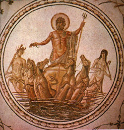 Anche l’Impero Romano, fondato sulle vestigia della grecità, adottò il simbolo dell’aureola. In una raffigurazione, Nettuno, dio del Mare è coronato da un’aureola ad anello, che ricorda molto a quelle che in seguito circonderanno il capo dei santi cristiani. Di seguito vi è una immagine di Romolo, il fondatore mitico di Roma. L’aureola di Romolo è rossa e a forma di stella, difficile da riconoscere contro lo sfondo scuro.