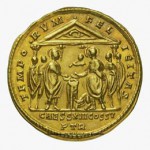 Con l’ascesa di Antonino Pio attorno al 100 d.C, gli imperatori romani iniziarono ad usare il nimbo nelle monete imperiali. Una moneta è chiamata, non a caso, “nimbate” quando viene decorata con una aureola. Gli imperatori Costantino e Galerio, attorno al 300 d.C. e talvolta anche quelli successivi venivano raffigurati con un’aureola, come anche Teodosio.