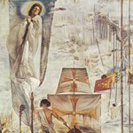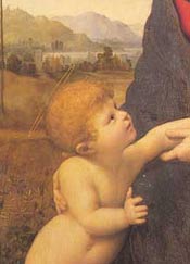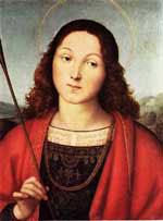 Successivamente, Piero della Francesca scelse di applicare le regole della prospettiva inclinando il nimbo tradizionale da una parte in modo che si librasse sulla testa.