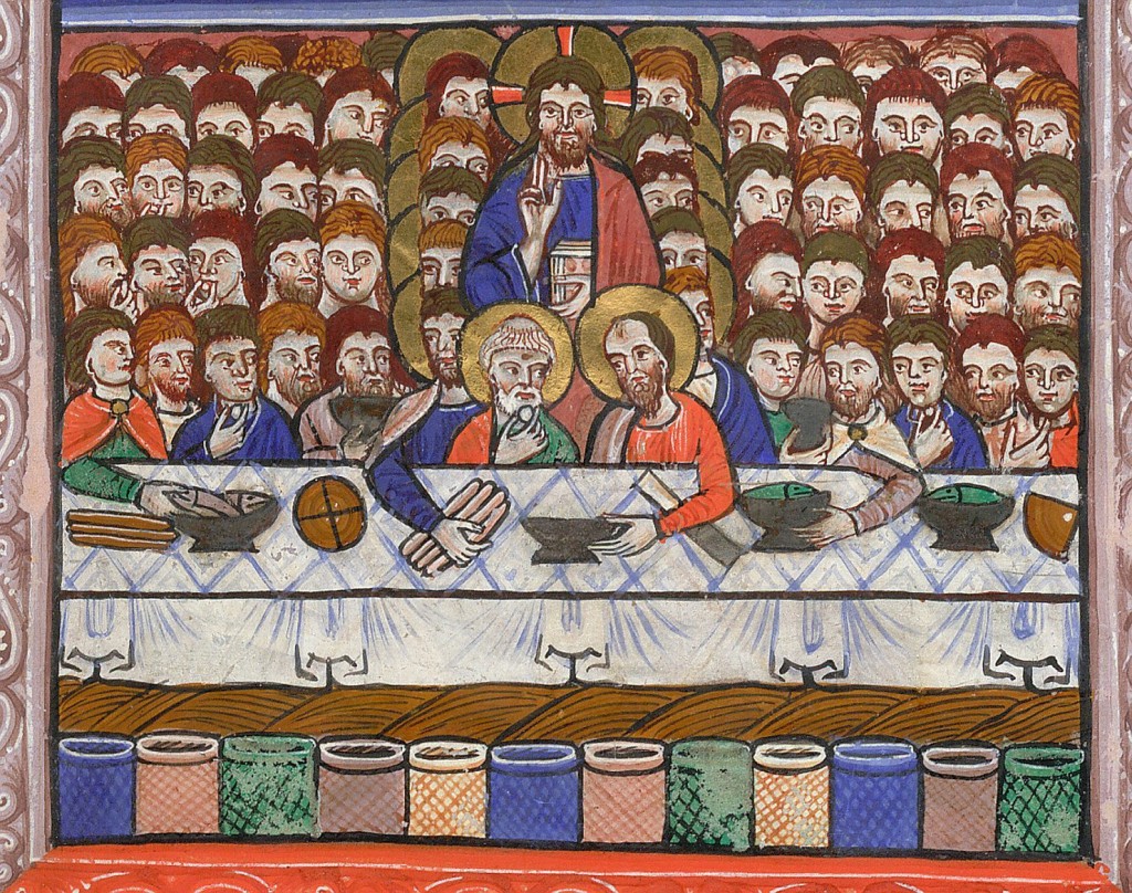 "Il miracolo della moltiplicazione dei pani e dei pesci", miniatura tratta da Libro di preghiere (1240 circa), British Library, Londra.