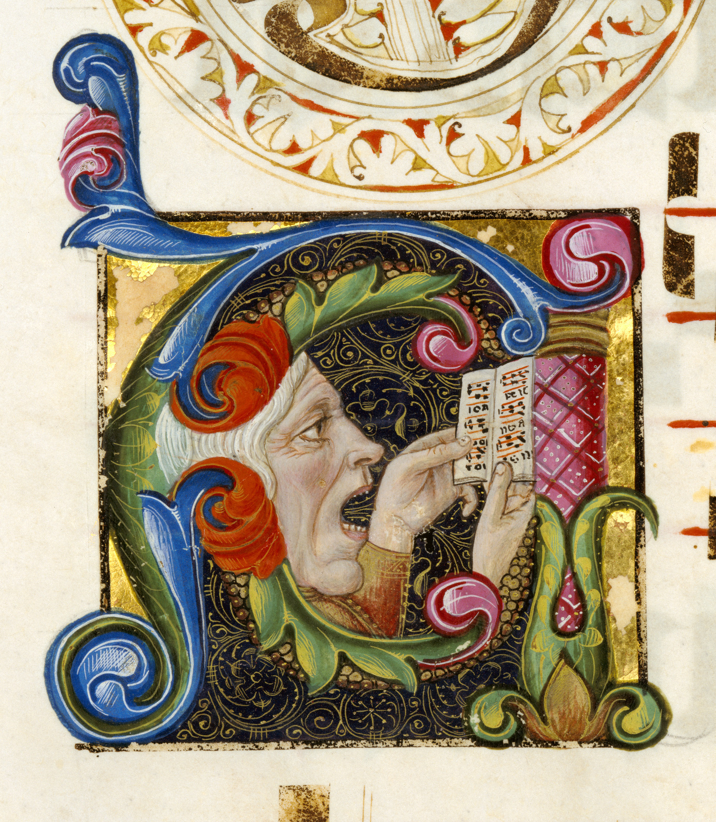 Iniziale "A" raffigurante un uomo che canta, tratta da Graduale (Italia, 1460 - 1480), Getty Museum, Los Angeles.