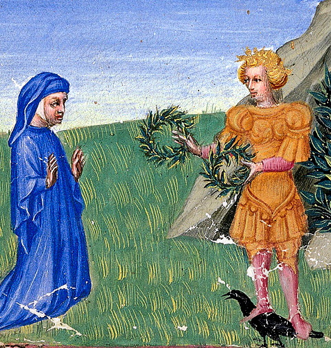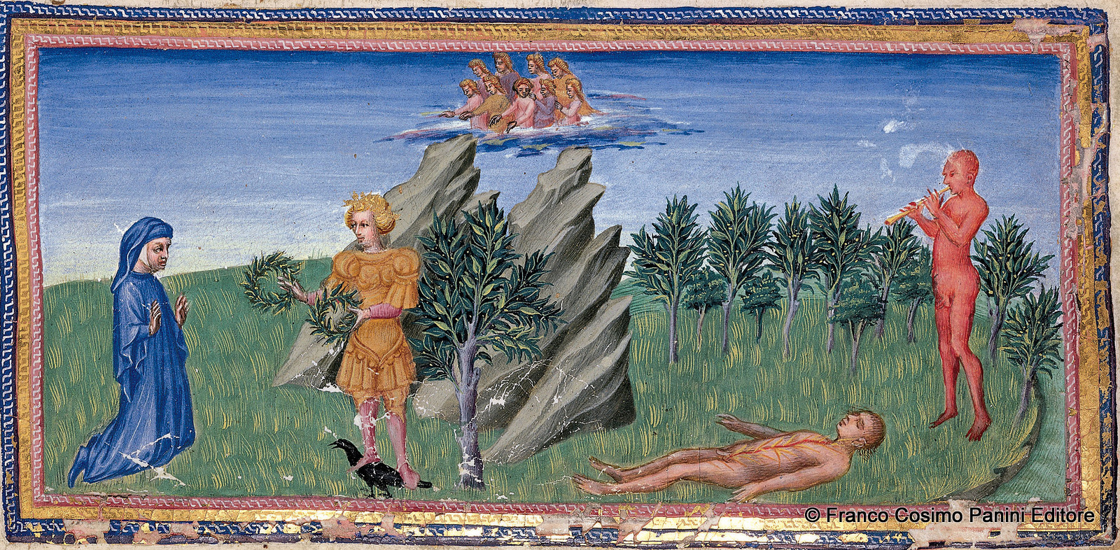 Sulla sinistra si scorge il poeta di fronte ad Apollo, che indossa una lucente armatura e gli porge due corone d’alloro: alle spalle si erge l’albero a lui caro, l’alloro appunto, in cui fu trasformata la ninfa Dafne, amata dal dio.
