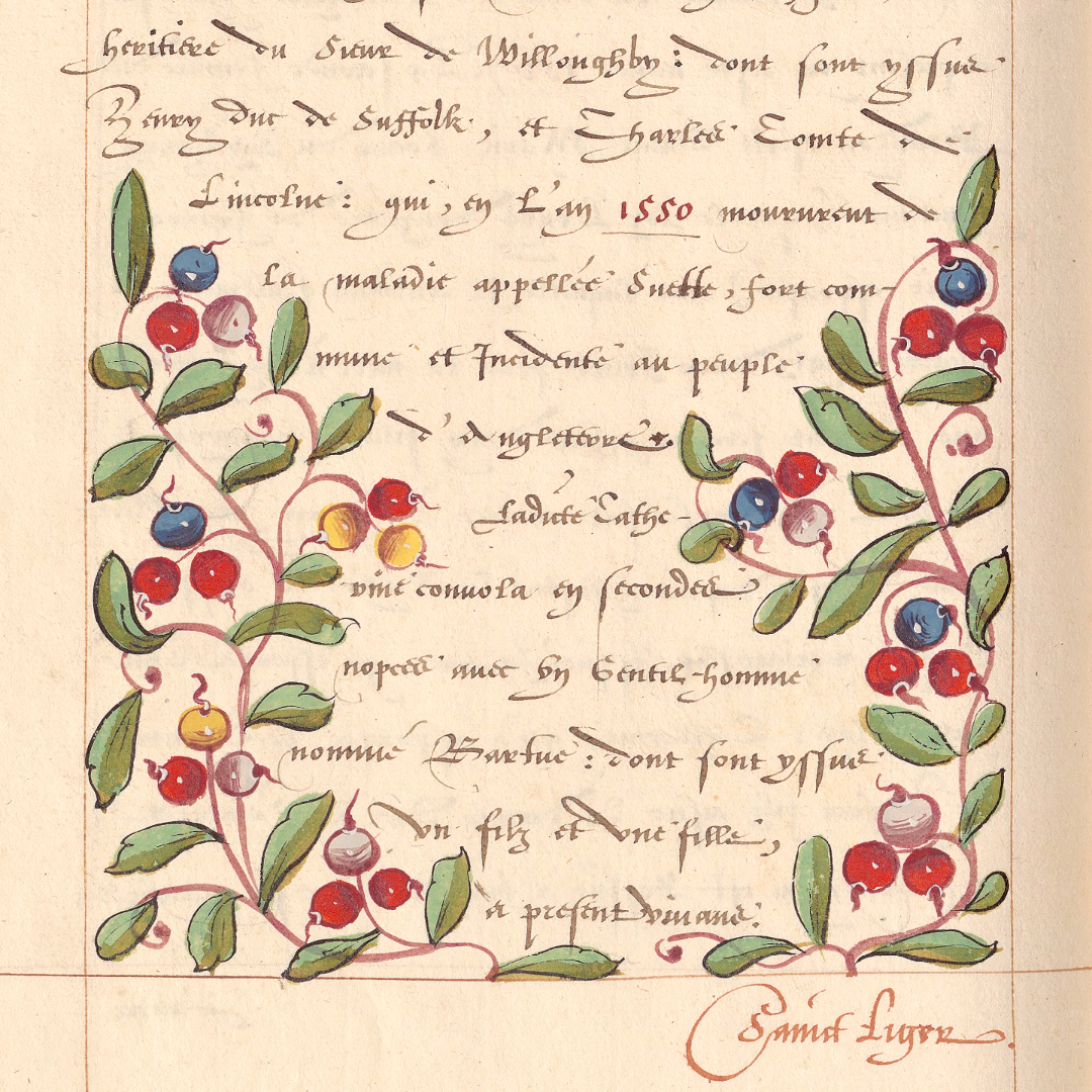 Miniatura tratta dal manoscritto “Recüeil des principaux seigneurs qui passèrent la mer avec Guillaume Conquéreur d'Angleterre, et de plusieurs autres qui, après le décès dudict Guillaume, se retirèrent en Angleterre, et quelz honneurs et estatz ilz ont eu en la Court des roys dudict païs jusques aprésent ; ensemble les gestes, alliances généalogiques, mariages et armaries des duc, marquis, comtes, vicomtes et barons estant de présent en honneur en la Court d'Angleterre” by Jean Benatrd, interprerer of the King, ms. Français 19000, p. 108, XVI secolo, Bibliothèque nationale de France, Département des manuscrits, Parigi.
