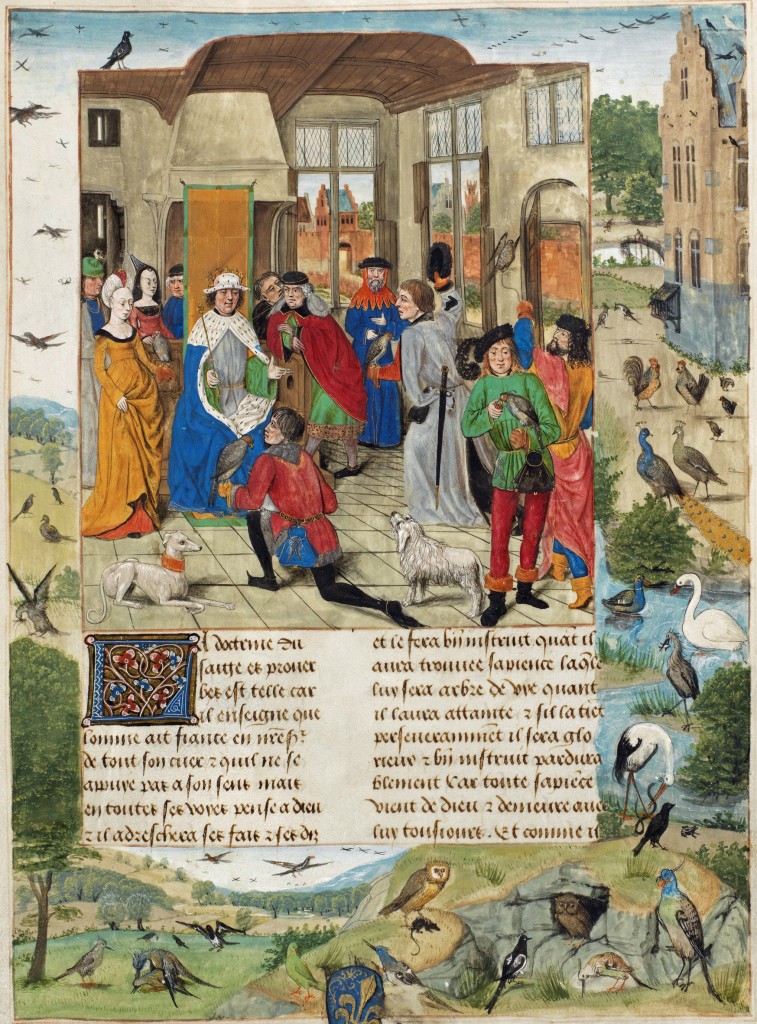 Pagina tratta dal 'Livre de l'art de chasser aux oiseaux' (Bruges, 1485-1490 circa), Bibliothèque de Genève.
