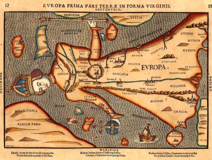 "Mappa Europae in Forma Virginis", illustrazione tratta da Itinerarium Sacrae Scripturae di Heinrich Bünting (1582).