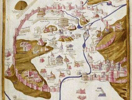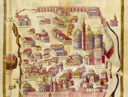"Mappa di Roma", miniatura tratta dalla 'Geografia di Tolomeo' (1470 circa), Bibliothèque nationale de France, Parigi.