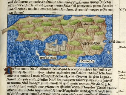 "Mappa dell'isola di Mikonos", miniatura tratta dal 'Liber insularum archipelagi' di Christoforo Buondelmonti (1482), British Library, Londra.