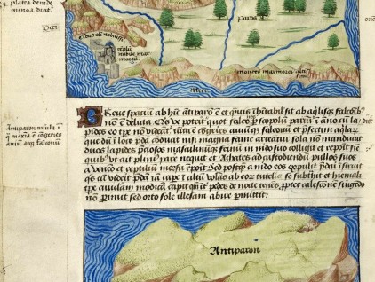 "Le isole greche di Paros e Antiparos", miniatura tratta dal 'Liber insularum archipelagi' di Christoforo Buondelmonti (1482), British Library, Londra.