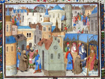 "A Clermont Pietro l'Eremita consegna al Papa Urbano II una lettera ricevuta dal Patriarca di Gerusalemme", miniatura tratta dalla 'Storia delle crociate di Guglielmo di Tiro' (1465), Bibliothèque de Genève.