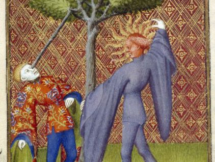Miniatura tratta dal manoscritto “L’Epistola di Othea”, in cui Apollo uccide Ganimede perforandogli l’occhio, Harley ms. 4431, c. 119v, XV secolo, British Library, Londra. Detail of a miniature of Apollo killing Ganymede by…