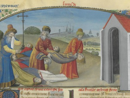 Miniatura tratta dal manoscritto “Il Libro della Regina”, ms. Harley 4431, c. 150r, 1410-1414 ca., British Library, Londra. Illumination from “The Book of the Queen”, ms. Harley 4431, c. 150r, c. 1410-1414, British Library, London.