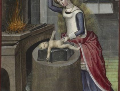 “La Natura che forgia un bambino”, miniatura tratta dal manoscritto "Roman de la Rose” di Guillaume de Lorris e Jean de Meun, ms. Harley 4425, c. 140r, 1490-1500 ca., British Library, Londra. “Nature forging a…
