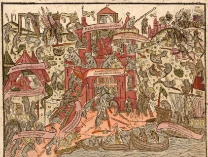 "La grande e meravigliosa battaglia tra gatti e topi", stampa del 1610, Bibliothèque nationale de France, Parigi.