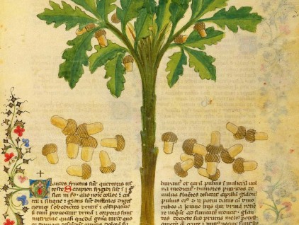 "Le ghiande sono i frutti della quercia. La polvere dei cappelli delle ghiande somministrata alla dose di mezza dracma con il vino rosso a digiuno a quelli che non riescono a trattenere l’urina, li riporta…