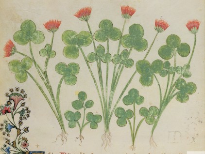 “La chioma del trifoglio all’inizio delle foglie emana odore di ruta che quando è cresciuta è simile per odore all’asfalto. Il suo seme è un valido presidio alle sofferenti di vulva, mentre la sua radice…