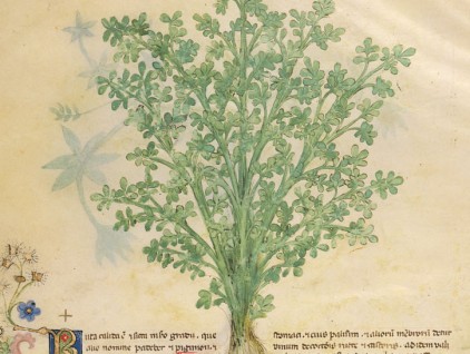 “Contro il tenesmo da causa frigida e il flusso del ventre, si cuoce la ruta nel vino, si fa un eucatisma, si riscalda il vino buono, si sparge sopra la ruta e il paziente riceve…