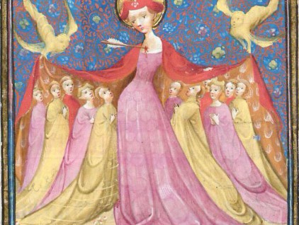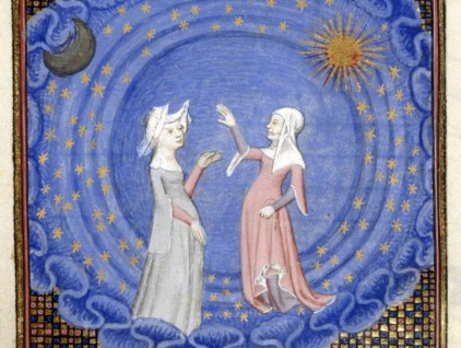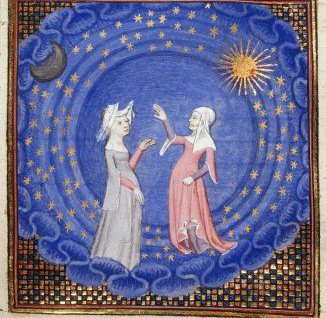 Detail of a miniature of Christine de Pizan and the Sibyl standing in a sphere of the cosmos, 1410-1414. Queen's Book, fol. 189v. Two women. BL MS Harley 4431, The Book of the Queen.