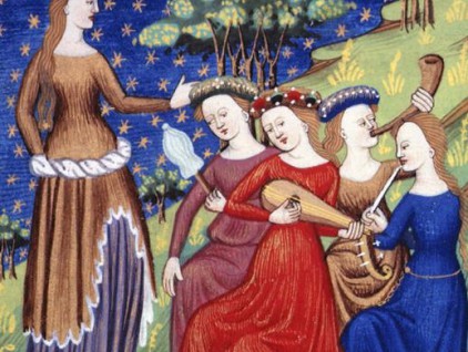Regina con quattro signorine che suonano strumenti musicali, XV sec. Queen with four attendant maidens playing musical instruments, XV sec.