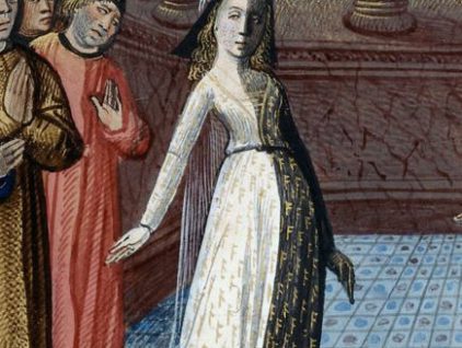 Dettaglio della miniatura tratta dal manoscritto "L' Epistola di Othéa", in cui uomini e donne porgono i propri cuori a Venere, dea dell’amore”, Harley MS 4431, c. 100r, XV secolo, British Library, Londra. Detail of a…