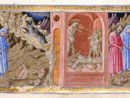 "Morte di Ugolino della Gheradesca", di Priamo della Quercia, miniatura tratta da una dopia della Divina Commedia, ms. Yates Thompson 36, c. 61r, fra il 1444 e il 1450 circa, British Library, Londra. «Poscia che fummo al quarto…