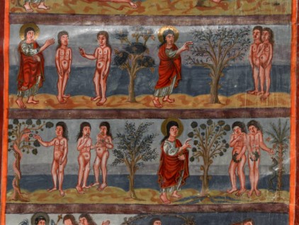 "Scene della Genesi", pagina miniata tratta dalla 'Bibbia Moutier-Grandval' (830-840 circa), British Library, Londra.