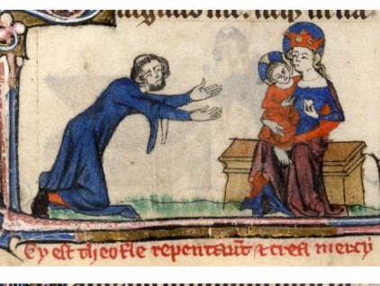 "Teofilo e il patto col diavolo", miniature tratte dalle 'Taymouth Hours' (Inghilterra, secondo quarto del XIV secolo), British Library, Londra. 1. Un mago conduce Teofilo davanti al diavolo, che gli consegna un cartiglio con un…