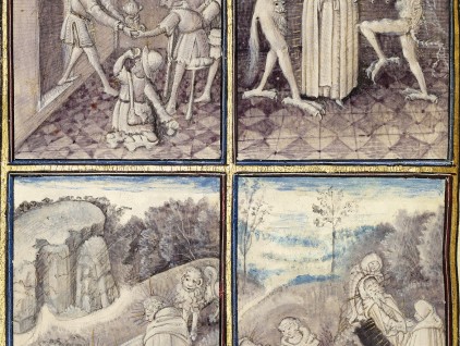 "Scene della vita di sant'Antonio", miniature tratte dall'opera 'Ritrovamento e traslazione del corpo di sant'Antonio' (Fiandre, 1465-1470), Getty Museum, Los Angeles. 1. Antonio dona i suoi beni ai poveri... 2. ... viene tormentato dai demoni... 3.…