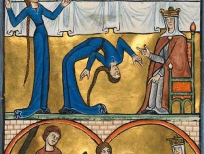 Miniatura tratta dal manoscritto “Munich Golden Psalter”, ms. 835, c. 137, XIII secolo, Bayerische Staatsbibliothek, Monaco di Baviera, Germania. Raffigura una Salomè incredibilmente flessibile e snella. Illumination from the manuscript "Munich Golden Psalter", ms.…