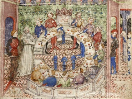 "I cavalieri seduti alla tavola rotonda", miniatura tratta da 'La Quête du Saint Graal et la Mort d'Arthus' (XV secolo), Bibliothèque nationale de France, Parigi.