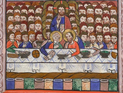 "Il miracolo della moltiplicazione dei pani e dei pesci", miniatura tratta da Libro di preghiere (1240 circa), British Library, Londra.
