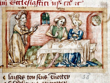 "Medea lancia un sortilegio all'infedele marito Giasone", illustrazione tratta dal ‘L’Epitre d’Othea di Christine de Pizan’ (1460 circa), Bibliothèque municipale, Lille.