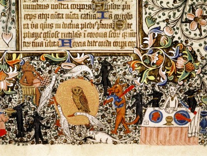 Miniatura tratta da Messale (metà XV secolo), Bodleian Library, Oxford. Nell'immagine si riconoscono: una volpe con cornamusa e una scimmia con tamburo accanto a un cerchio di oche danzanti intorno a una civetta; un gatto…