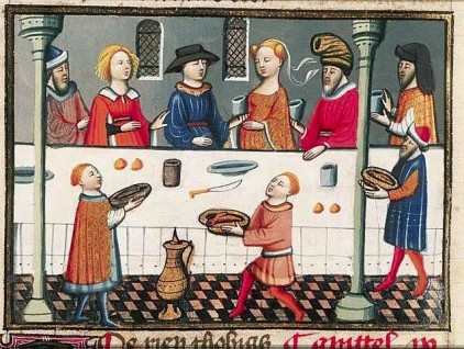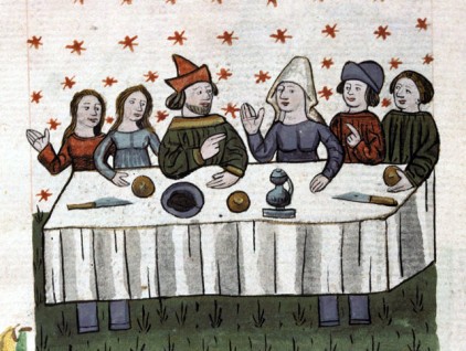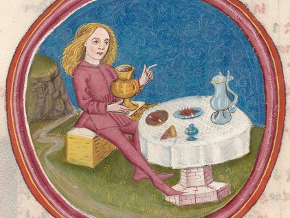 "Il banchetto nuziale di Tobia e Sara", miniatura tratta da 'Storie della Bibbia' (1430 circa), Koninklijke Bibliotheek, L'Aia.