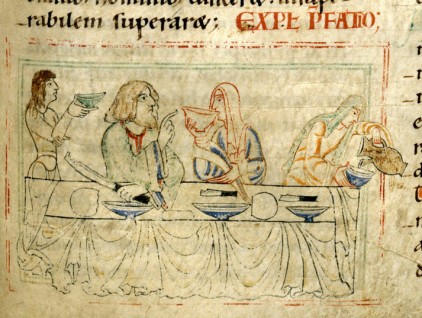 "Giuditta e Oloferne durante il banchetto", miniatura tratta dalla 'Bibbia di Sainte Etienne Harding' (1109-1111 circa), Bibliothèque municipale, Digione.