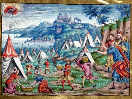 "Il popolo d'Israele raccoglie la manna caduta dal cielo", miniatura tratta da 'Canti a quattro voci per le principali festività dell'anno liturgico' (1562), Biblioteca dell'Abbazia di San Gallo, Svizzera.