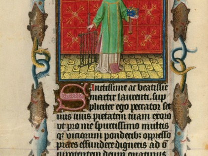 "San Lorenzo con cornice raffigurante un intreccio di pesci", miniatura tratta dal 'Libro d'Ore di Cathèrine de Clèves' (1440 circa), Morgan Library & Museum, New York. (Incredibile ma vero: la scelta dei pesci per la…