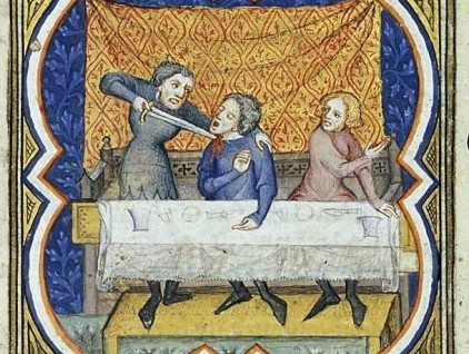 "Amnon ucciso durante il banchetto di Assalone", miniatura tratta dalla 'Grande Bible Historiale Complétée' (1371-1372), Koninklijke Bibliotheek, L'Aia.