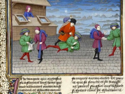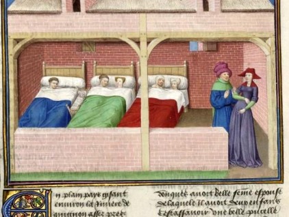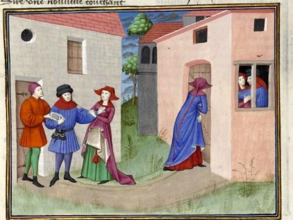 Nona giornata, nona novella: "A consigliarli il saggio Salomone: Melisso impara ad amare per essere amato, Giosefo a battere la moglie per essere rispettato". Miniatura tratta dal ‘Decameron’ (codice del XV secolo), Bibliothèque de l’Arsenal, Parigi.