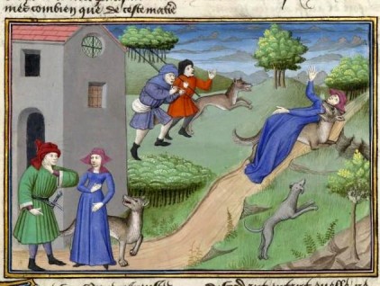 Nona giornata, settima novella: "Ha fatto il marito un sogno cupo: "Evita il bosco, che c'e un lupo". Andrà la donna, malfidata. E, da presagio, sarà sfregiata". Miniatura tratta dal ‘Decameron’ (codice del XV secolo), Bibliothèque…